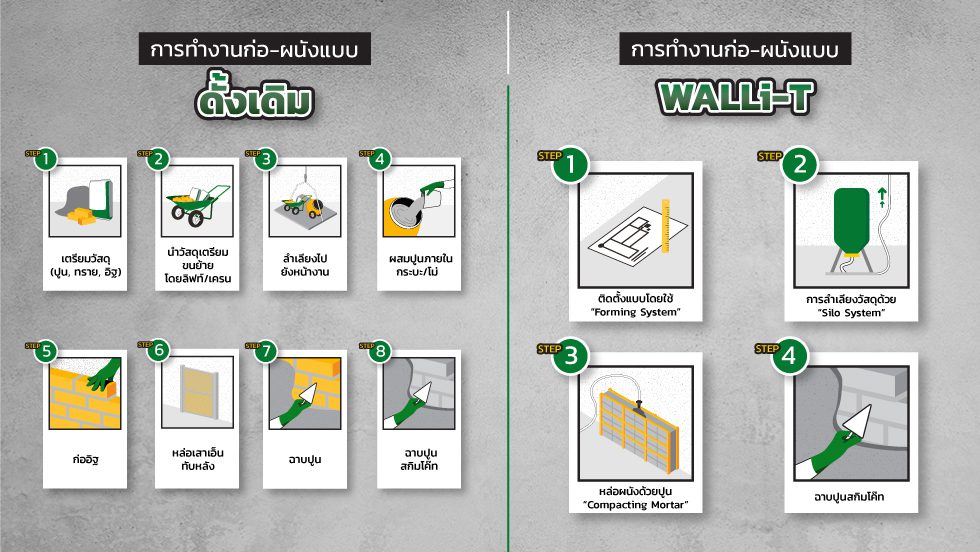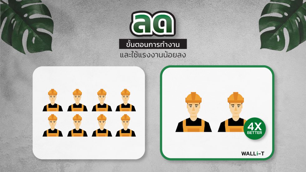 4. ลดขั้นตอนการทำงาน การทำงานก่อ-ฉาบผนังแบบดั้งเดิม ทำให้การทำงานเร็วขึ้น และใช้แรงงานน้อยลง รวมถึงการซ่อมแซม และการแก้ไขงานก็น้อยลงตามไปด้วย