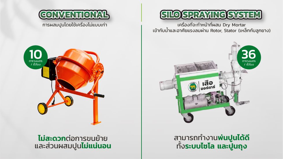 จากการทำงานปูนซีเมนต์รูปแบบเดิมที่ต้องมีการเตรียมวัสดุก่อสร้าง การขน การผสมปูน และการผสมทรายจนไปถึงขั้นตอนการฉาบ ซึ่งงานรูปแบบนี้ค่อนข้างใช้เวลา และมีหลากหลายขั้นตอน แต่ระบบ Silo Spraying คือ ระบบการก่อสร้างที่จะช่วยลดการทำงานลงถึง 5 ขั้นตอน ที่จะทำให้การทำงานเร็วขึ้น และใช้คนงานน้อยลง เพียงเดินระบบเครื่องพ่น และทำการพ่นปูน จากนั้นเดินระบบไซโลทำการลำเลียงปูนขึ้นมายังเครื่อง
