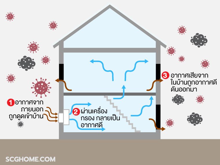 เมื่ออากาศนอกบ้านเต็มไปด้วยฝุ่นและเชื้อโรค หลายคนอาจเลือกปิดบ้าน ปิดประตูหน้าต่างมิดชิด เพื่อป้องกันสิ่งไม่พึงประสงค์เข้าบ้าน แม้กระนั้น อากาศในบ้านที่เราหายใจเข้าไปก็ใช่ว่าจะเป็นอากาศดีเสมอไป เพราะจริงๆ แล้ว ยังคงมีฝุ่นและเชื้อโรคที่เล็ดลอดเข้ามาในบ้านได้อยู่ ในขณะเดียวกัน เมื่อเราปิดบ้านมิดชิด การระบายอากาศในบ้านอาจไม่เพียงพอ ก็ส่งผลเสียต่อสุขภาพอีกด้วย แล้วถ้าเราต้องการให้อากาศในบ้านเป็นอากาศดีที่มีคุณภาพ จะทำอย่างไร SCG HOME ขอยกประเด็นนี้มาเล่าให้เจ้าของบ้านได้ทำความเข้าใจกัน