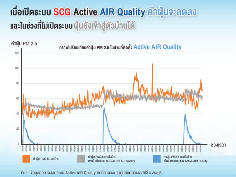 ส่วนบ้านที่มีระบบ SCG Active AIR Quality อากาศจากภายนอกจะถูกกรองให้สะอาดปราศจากฝุ่น เชื้อโรค กลิ่น ตั้งแต่แรกก่อนที่จะนำเข้ามาในบ้าน ในขณะเดียวกันก็ระบายอากาศเสียในบ้านออกไป (พร้อมกับความชื้น CO2 สารก่อภูมิแพ้ ฯลฯ) ช่วยเพิ่มออกซิเจนในบ้านได้ และยังเป็นอีกปัจจัยช่วยลดความเสี่ยงการรับเชื้อโรคในพื้นที่ปิด นอกจากนี้การที่อากาศเสียในบ้านถูกดันออกทางช่องรอยต่อต่างๆ อยู่เสมอ ยังเป็นการป้องกันไม่ให้อากาศเสียจากภายนอกซึมเข้ามาในบ้านได้อีกด้วย