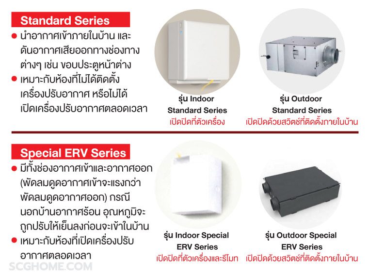 จะเห็นได้ว่าระบบ SCG Active AIR Quality เป็นอีกทางเลือกของในการปรับคุณภาพอากาศภายในที่อยู่อาศัย เพื่อสุขภาพที่ดีของสมาชิกในครอบครัว ทั้งนี้ SCG Active AIR Quality สามารถติดตั้งเฉพาะห้อง หรือกระจายจุดติดตั้งทั้งบ้าน หรือจะติดตั้งในคอนโดมิเนียมก็ได้ ชุดอุปกรณ์จะมีให้เลือกทั้ง “แบบ Standard” สำหรับห้องที่ไม่มีเครื่องปรับอากาศ (หรือมีแต่เปิดแค่บางช่วงเวลา) กับแบบ “Special ERV” ซึ่งเหมาะกับห้องที่เปิดเครื่องปรับอากาศตลอดเวลา โดยแบบ Special ERV นี้จะมีช่องพร้อมพัดลมดูดอากาศสำหรับทั้งอากาศเข้าและอากาศออก โดยอากาศภายนอกที่นำเข้ามาในบ้านจะถูกปรับอุณหภูมิให้เย็นลงก่อนเข้าบ้านเสมอ เจ้าของบ้านจึงไม่ต้องกังวลว่า อากาศร้อนจากภายนอกจะถูกดูดเข้ามาในบ้านจนทำให้บ้านร้อนขึ้น เปลืองไฟมากขึ้น