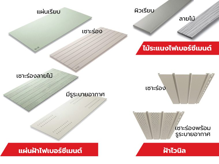 อาจเป็นได้ทั้งแบบแผ่นเรียบตีเว้นร่องธรรมดา หรือหากต้องการอารมณ์ใกล้เคียงไม้ อาจใช้วัสดุไฟเบอร์ซีเมนต์ ซึ่งมีทั้งในรูปของแผ่นฝ้าแบบเซาะร่อง หรือไม้เทียมทำเป็นฝ้าไม้ระแนงตีชนชิด ทั้งนี้ รูปแบบต่างๆ ที่เล่าไปสามารถนำมาผสมผสานเพื่อให้เกิดแพทเทิร์นที่น่าสนใจได้