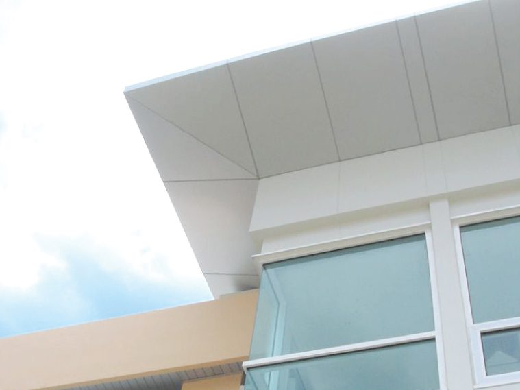 ภาพ: ฝ้าเพดานภายนอกแบบแผ่นทึบ ติดตั้งเว้นร่อง ล้อกับผนัง