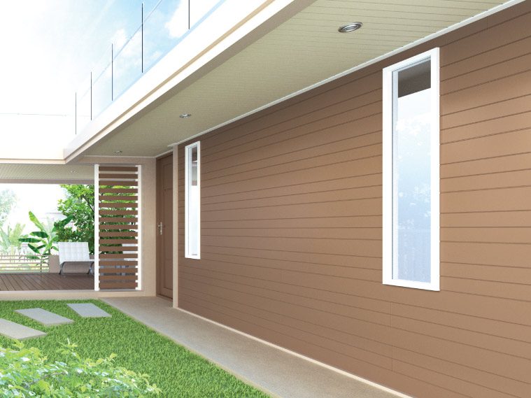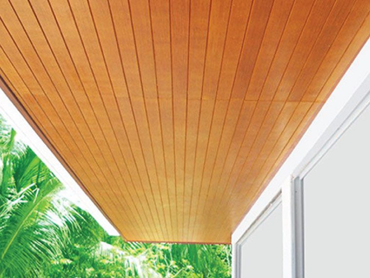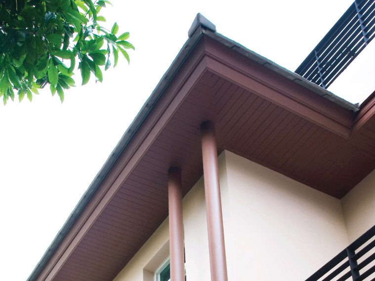 ฝ้าเพดานภายนอกแผ่นทึบแบบเซาะร่อง ทาสีน้ำตาลให้อารมณ์คล้ายระแนงไม้