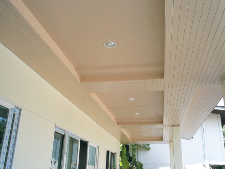 ภาพ: ฝ้าเพดานภายนอกแผ่นทึบแบบเซาะร่องทาสีครีม