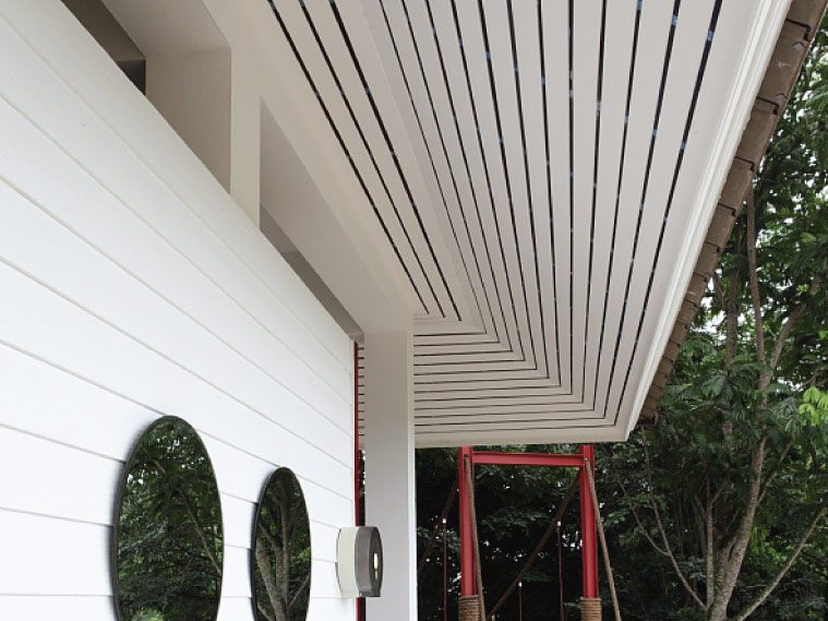 ภาพ: ฝ้าเพดานภายนอกแบบผสมผสาน ทั้งฝ้าแผ่นทึบ ฝ้าระบายอากาศ และระแนงไม้ตีเว้นร่องระบายอากาศ