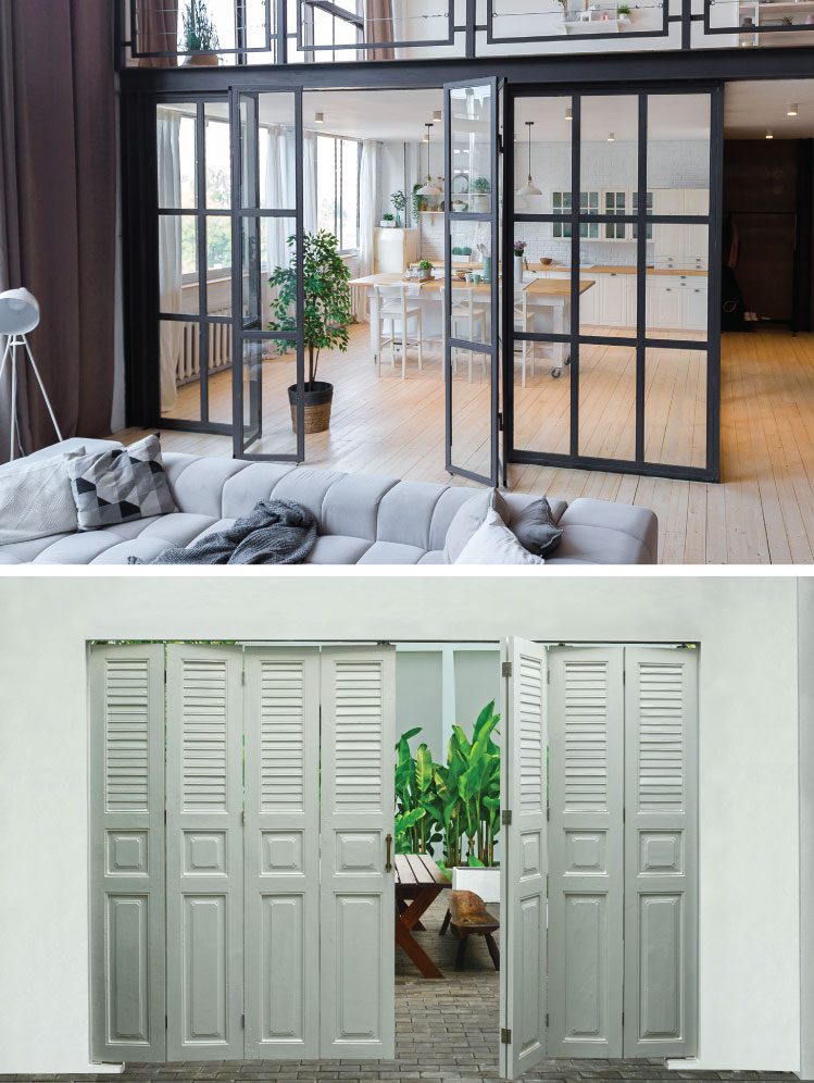 - ประตูบานเฟี้ยม เป็นการนำบานประตูมาต่อกันด้วยบานพับ การเปิดจะเป็นลักษณะพับทบสลับกันไปรวมที่ด้านใดด้านหนึ่งหรือทั้งสองด้าน จึงเปิดได้กว้างกว่าประตูรูปแบบอื่น นิยมนำมาใช้กั้นแบ่งพื้นที่ให้เป็นสัดส่วน หรือเป็นฉากกั้นห้องภายในบ้าน เช่น กั้นพื้นที่รับประทานอาหารออกจากพื้นที่นั่งเล่น เป็นประตูจากห้องนั่งเล่นออกสู่ระเบียง ประตูรูปแบบนี้นอกจากจะมีฟังก์ชั่นที่เปิดได้สุดแล้ว ยังนิยมใช้เป็นองค์ประกอบในการตกแต่งบ้านเพราะมีความสวยงามอีกด้วย