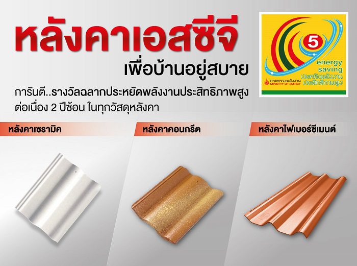 1. เลือกหลังคาเอสซีจี…เพื่อบ้านอยู่สบาย การันตีรางวัล “ฉลากประหยัดพลังงานประสิทธิภาพสูง” ต่อเนื่อง 2 ปีซ้อน ในทุกวัสดุหลังคา นอกเหนือจากความพึงพอใจในด้านรูปลักษณะและความสวยงามของกระเบื้องหลังคาการเลือกหลังคาที่ช่วยลดความร้อนให้กับบ้านของคุณ ก็จะสามารถลดรายจ่ายในระยะยาวให้กับคุณได้ไม่น้อย