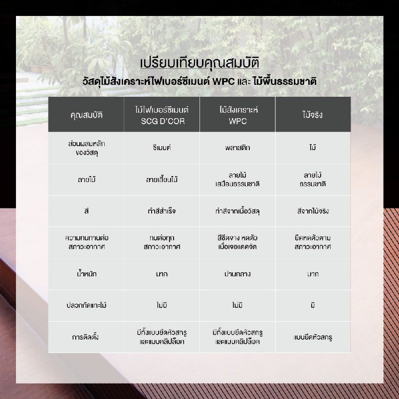 ปัญหาสำคัญของไม้จริงก็คือ ปลวกกัดกินเนื้อไม้ จนทำให้ไม้เปราะ ผุพัง ใช้งานได้ไม่กี่ปีก็ต้องซ่อมแซมหรือต้องเปลี่ยนใหม่ แต่ไม้พื้น เอสซีจี มีคุณสมบัติที่เหนือกว่าไม้จริง ด้วยวัสดุไฟเบอร์ซีเมนต์ ที่มีเนื้อเหนียวแน่น แข็งแรง ทนทานมากยิ่งขึ้น รับน้ำหนักได้ดี มาพร้อมกับเทคโนโลยี X-Trusion ที่มีการเคลือบใสบนผิวหน้าไม้ ทำให้สามารถทาสีทับได้สีติดแน่นทนทาน มีลายเสี้ยนไม้ที่ชัด ให้ความสวยงามเป็นธรรมชาติ และผิวสัมผัสเหมือนไม้จริงแต่มีน้ำหนักเบากว่าไม้จริง สะดวกในการติดตั้งและขนย้าย ทนต่อทุกสภาพอากาศ โดยเฉพาะไม้พื้น เอสซีจี รุ่น Basic และ Saver หากต้องการปรับปรุงให้ดูใหม่ หรือเปลี่ยนสีใหม่ ก็สามารถทาสีทับได้ตามต้องการ