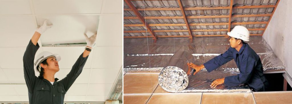 - หากบนฝ้าจะมีสายไฟ ต้องเก็บสายไฟไว้ในท่อให้เรียบร้อย จึงจะติดตั้งฉนวนได้ ซึ่งลูกค้าต้องเป็นผู้ดำเนินการให้เแล้วเสร็จก่อนติดตั้งฉนวน