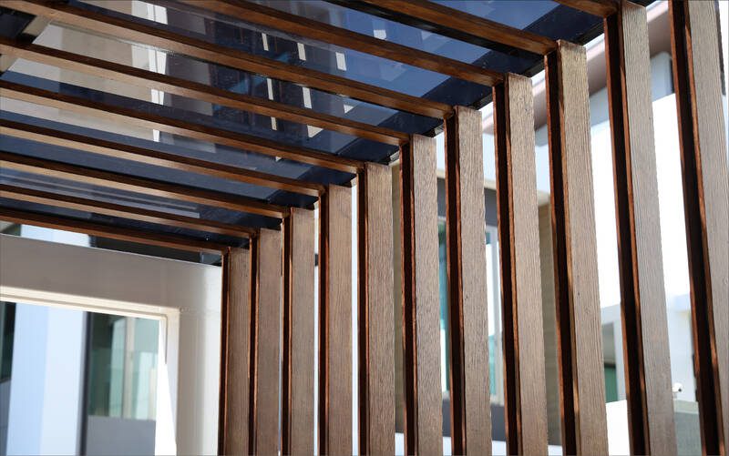 ตัวอย่างการนำไม้ตกแต่งอเนกประสงค์ เอสซีจี เดคคอร์ รุ่น ไลน์ ไปใช้งานในส่วนของหลังคาโรงจอดรถ ได้ทำการติดตั้งเข้ากับโครงเหล็กตามแนวความกว้างของหลังคา วางทับด้วยวัสดุโปร่งแสง ส่วนผนังด้านข้างพรางตาและเพิ่มให้เป็นสัดส่วนด้วย รั้วตกแต่ง เอสซีจี เดคคอร์ รุ่น เฟนซ์ ให้ลวดลายสีสันที่เหมือนไม้จริง มีความแข็งแรง ทนทานเหมาะกับการใช้งานภายนอก