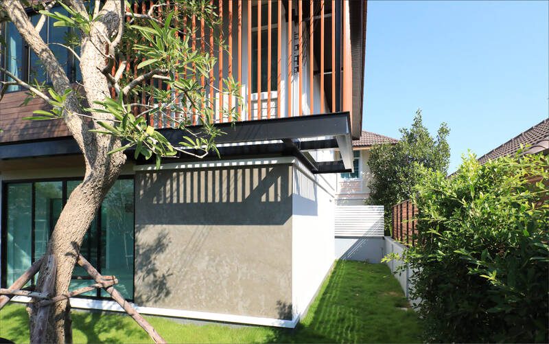 การนำระแนงไม้มาใช้ร่วมกับบ้านโมเดิร์นได้รับความนิยมอย่างต่อเนื่อง เพราะคุณสมบัติของระแนงที่ให้ เส้นสายที่ดูสวยงาม เสริมความสมดุลให้กับบ้านทรงสี่เหลี่ยมมีความอ่อนโยนยิ่งขึ้น ยังช่วยลดทอนความร้อนจากแสงแดดที่ส่องเข้าผนังบ้าน และยังตอบโจทย์การใช้ชีวิตยุคปัจจุบันที่ต้องการเปิดโปร่งด้วยงานกระจก แต่ในขณะเดียวกันความโปร่งนั้นต้องมีความเป็นส่วนตัวให้เจ้าของบ้านได้ใช้ชีวิตภายในบ้านอย่างเป็นอิสระจากสายตาเพื่อนบ้านด้วย SCG D’COR ตอบโจทย์ฟังก์ชันนี้ด้วยไม้ตกแต่งอเนกประสงค์ เอสซีจี เดคคอร์ รุ่นไลน์ รองรับความยาวสูงสุดขนาด 3 เมตร ซึ่งจะสอดคล้องกับความสูงของอาคารที่สถาปนิกมักออกแบบให้แต่ละชั้นของบ้านมีความสูง 3 เมตรโดยประมาณ สามารถนำไปใช้ได้ทั้งที่เป็นระแนงบังแดด พรางสายตา รวมถึงหลังคาระเบียงและหลังคาโรงจอดรถในส่วนที่ต่อเติมใหม่