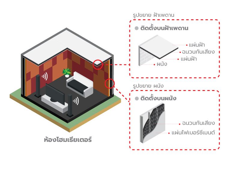 สำหรับใครที่ต้องการทำห้องที่ต้องมีการใช้เสียง ไม่ว่าจะเป็น ห้องโฮมเธียเตอร์ ห้องอัดเสียง ห้องประชุม ออฟฟิศ และห้องเรียน ควรได้รับการออกแบบให้มีค่าการกันเสียงและค่าดูดซับเสียงที่เหมาะสมกับแต่ละห้อง โดยปรึกษาผู้เชี่ยวชาญเฉพาะทาง เพื่อการใช้งานอย่างเต็มประสิทธิภาพ