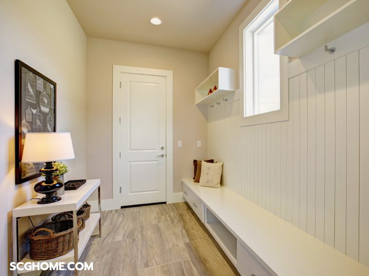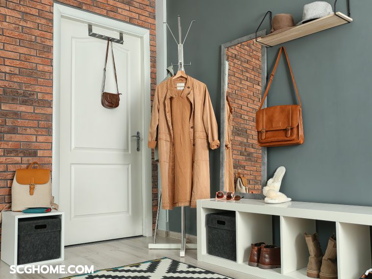 ที่ควรเตรียมไว้ในส่วนโถงทางเข้าบ้าน ไม่ว่าจะเป็นส่วนจัดเก็บรองเท้า กระเป๋า เสื้อคลุม หรือของใช้ ทำได้ทั้งเฟอร์นิเจอร์แบบติดกับที่ (Built-in) หรือเป็นเฟอร์นิเจอร์ลอยตัว เลือกได้ตามรูปแบบที่ชอบ เพื่อเพิ่มความสวยงามน่าอยู่อาศัย และเพิ่มพื้นที่เก็บของภายในบ้าน การติดรูปภาพ หรือกระจกในส่วนนี้จะทำให้พื้นที่โถงทางเข้าบ้านดูน่าสนใจและดูกว้างขึ้น การติดตั้งโคมไฟเหนือโต๊ะ หรือการเพิ่มไฟส่องภาพช่วยเพิ่มบรรยากาศให้น่าอยู่ขึ้น สำหรับช่วงที่ต้องระวังเรื่องโรคติดต่อ การเตรียมมุมเล็กๆ สำหรับวางเจลล้างมือ กล่องเก็บหน้ากากอนามัย และตะกร้าทิ้งหน้ากากที่ใช้แล้วในบริเวณนี้ก็เป็นอีกรายละเอียดสำคัญช่วยให้บ้านปราศจาคเชื้อโรคได้อีกทางหนี่ง