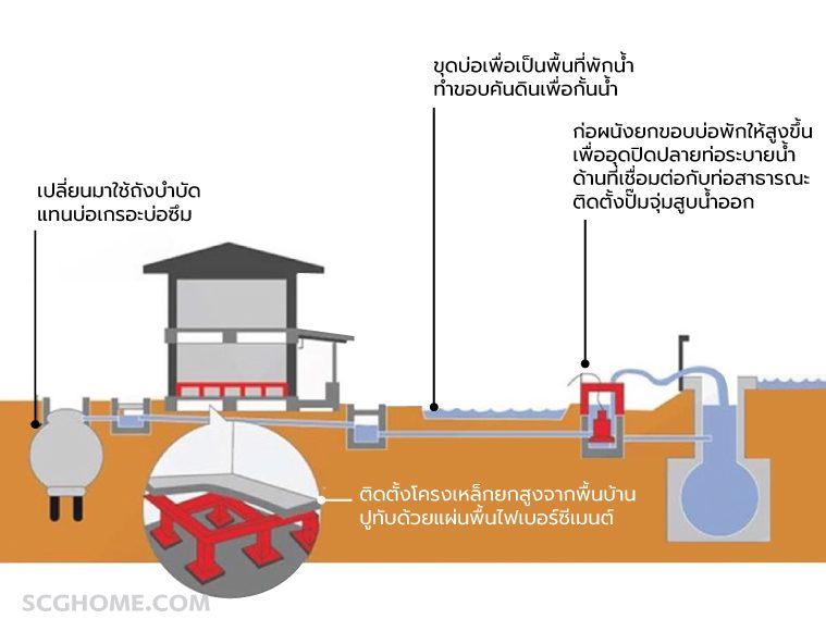 หากน้ำเสียในบ้านระบายออกสู่ท่อสาธารณะไม่ได้เนื่องจากบ้านต่ำกว่าถนน ถนนหน้าบ้านและระดับท่อระบายน้ำสาธารณะถูกยกให้สูงขึ้น ทำให้การระบายน้ำจากภายในบ้านออกสู่ด้านนอกเป็นไปได้ยาก