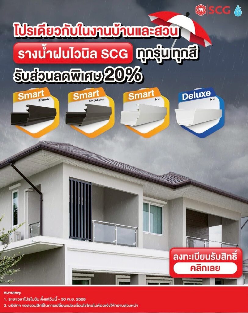 โปรโมชั่นลดส่งท้ายหน้าฝน รางน้ำฝนไวนิล SCG ทุกรุ่น ทุกสี รับส่วนลดพิเศษ 20%
