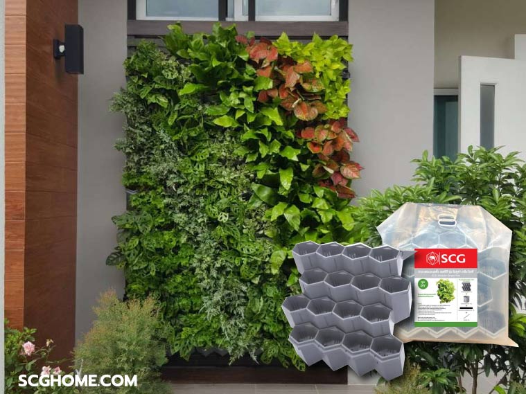 หากอยากลดร้อนด้วยพื้นที่สีเขียว แต่พื้นที่รอบบ้านมีจำกัด ก็จัดเป็นสวนแนวตั้งแทนได้ง่ายๆ โดยใช้ชุดกระถางปลูกสวนแนวตั้งสำเร็จรูป ที่ประกอบด้วยแผงแขวน และกระถางสำหรับใส่ต้นไม้ขนาดเล็ก สามารถถอดใส่และรดน้ำได้สะดวกง่ายดาย