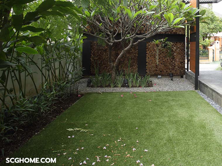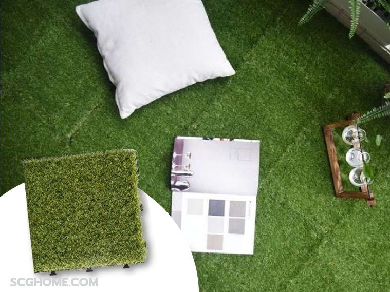 พื้นคอนกรีตรอบบ้านซึ่งร้อนระอุเวลาแดดส่อง หากอยากเปลี่ยนเป็นพื้นที่สีเขียวให้เย็นขึ้น แต่ไม่อยากจะต้องคอยตัดหญ้าให้ยุ่งยาก ก็สามารถเลือกใช้หญ้าเทียมแทนได้ โดยวัสดุหญ้าเทียมจะสะสมความร้อนน้อยกว่าพื้นคอนกรีต มีโทนสีเขียวอ่อนเข้มให้เลือกหลาย และบางรุ่นยังมีใบหญ้าสีน้ำตาลแซม ให้ลุคที่เป็นธรรมชาติเสมือนพื้นหญ้าอย่างมาก หญ้าเทียมสามารถติดตั้งได้ทั้งบนพื้นคอนกรีตและพื้นดิน มีทั้งในรูปแบบม้วนผืนใหญ่ กับแบบแผ่นขนาดเล็กให้เจ้าของบ้านลงมือปูเองได้อย่างสะดวกง่ายดาย