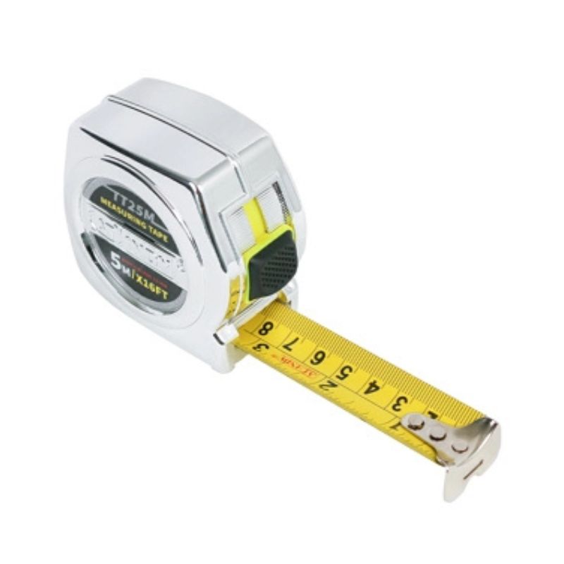 ตลับเมตรชุบโครเมี่ยม AT INDY รุ่น TT25M ขนาด 5 ม.x 25 มม. ใช้สำหรับวัดระยะในงานก่อสร้าง งานช่างไม้ งานตกแต่งภายใน หรืองาน DIY เหมาะสำหรับการใช้งานที่ต้องการความแม่นยำสูง ครงสร้างโลหะชุบโครเมี่ยม เพิ่มความแข็งแรง ทนต่อการกระแทก และป้องกันสนิม กว้าง 25 มม. ทำจากเหล็กกล้าเคลือบด้วยไนลอน (Nylon Coating) เพื่อเพิ่มความทนทาน ตัวเลขชัดเจน อ่านง่าย ทั้งหน่วยมิลลิเมตรและเซนติเมตร