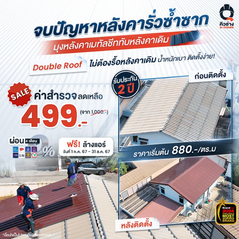 บริการซ่อมแซมหลังคาบ้านด้วยวิธี Double roof จบปัญหารั่วซึม ไม่ต้องรื้อหลังคาเก่า งานเสร็จไว โดยช่างผู้เชี่ยวชาญเรื่องหลังคาจากคิวช่าง การันตีคุณภาพ คิวช่างซ่อมจบแล้ว กว่า 7,000 หลัง