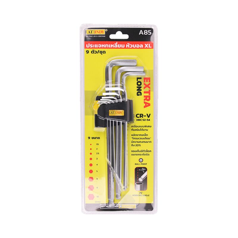 ประแจหกเหลี่ยมหัวบอล AT INDY รุ่น A85 9ตัว/ชุด ขนาด L231 มม. ใช้ขันหรือคลายน็อต/สกรูหัวหกเหลี่ยม (Hexagonal Socket Screws) เหมาะสำหรับงานซ่อมบำรุง งานเครื่องจักร และงานช่างทั่วไป ขนาดมาตรฐาน 9 ตัวในชุด (1.5 , 2 , 2.5 , 3 ,4 , 5 , 6 , 8 , 10 มม.) สามารถเปิด-ปิด ตัวล็อคได้ ขนาดกะทัดรัด พกพาสะดวก หัวบอลปรับเอียงได้ถึง 25 องศา สามารถใช้กับงานที่มีพื้นที่จำกัดและยังทำให้ขันน็อตได้ง่ายและเร็วขึ้นอีกด้วย
