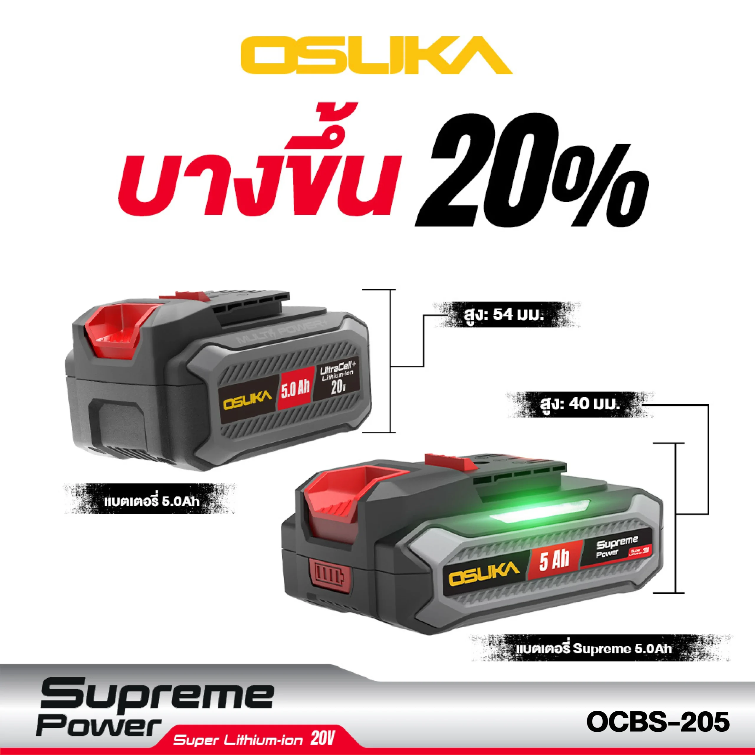 ก้อนแบตเตอรี่ 5.0Ah Osuka รุ่น Supreme Power OCBS-205 เพิ่มพลังให้เครื่องมือไร้สายของคุณด้วย ขนาด 5.0 Ah ตัวช่วยสำคัญที่จะทำให้งานของคุณไม่มีสะดุด