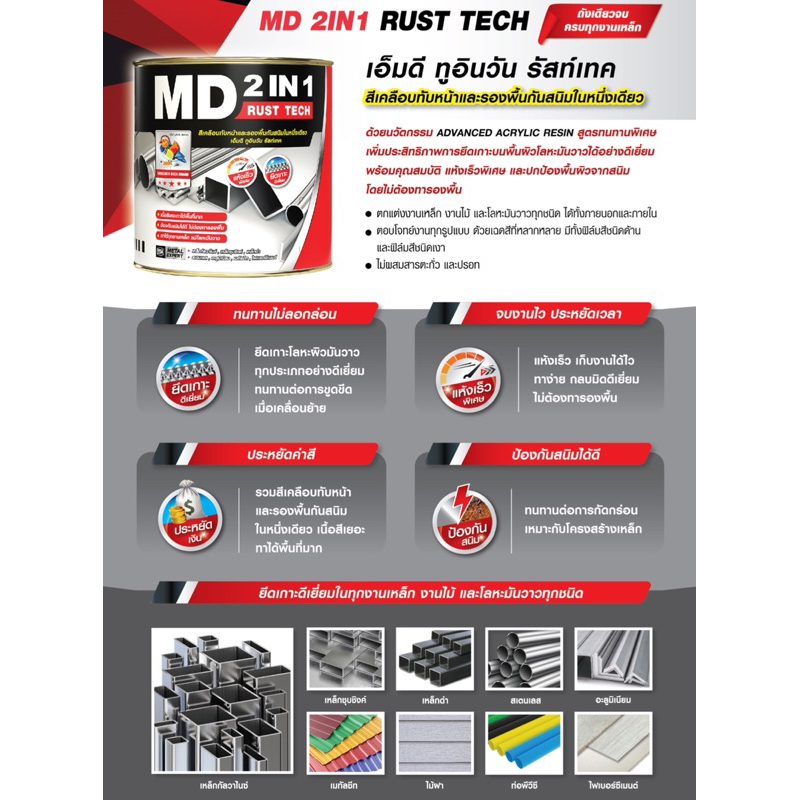 TOA MD 2 In 1 MG111 Rust Tech MG999 Gloss Black ด้วยนวัตกรรม ADVANCED ACRYLIC RESIN สูตรทนทานพิเศษ เพิ่มประสิทธิภาพให้สีเคลือบเงากันสนิมยึดเกาะบนพื้นผิวโลหะมันวาวได้อย่างดีเยี่ยม พร้อมคุณสมบัติ แห้งเร็วพิเศษ และปกป้องพื้นผิวจากสนิม โดยไม่ต้องทารองพื้น เหมาะสำหรับตกแต่งงานเหล็ก งานไม้ และโลหะมันวาวทุกชนิด สามารถใช้งานได้ทั้งภายในและภายนอก ไม่มีส่วนผสมของสาระตะกั่ว และปรอท ปลอดภัยต่อการใช้งานด้วยมาตรฐานการผลิตจาก TOA