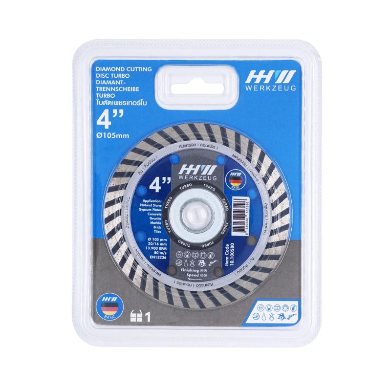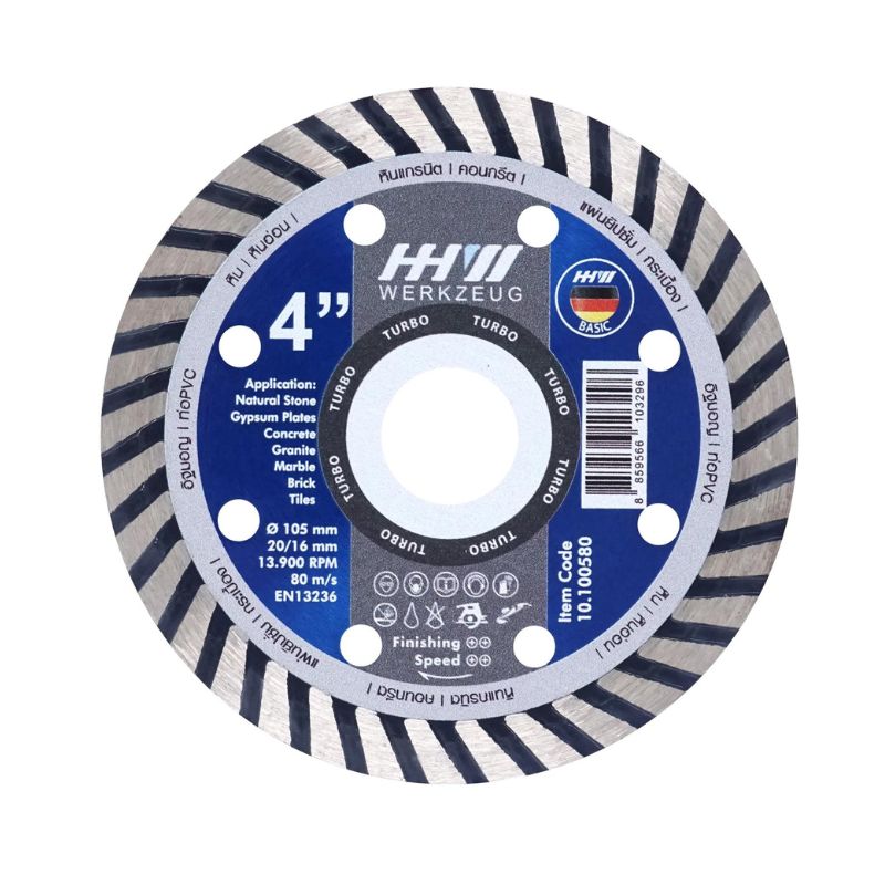 HHW ใบตัดเพชรเทอร์โบ DIAMOND CUTTING DISC TURBO ขนาด 4 นิ้ว ประสิทธิภาพสูง ตัดเนี้ยบ เฉียบคม เหมาะกับงานหนัก สำหรับใช้ตัด ตัดหิน หินอ่อน หินแกรนิต คอนกรีต แผ่นยิปซั่ม กระเบื้อง อิฐมอญ ท่อพีวีซี ผลิตจากวัสดุเหล็กกล้า ไม่เป็นสนิม อายุการใช้งานยาวนาน ทนทานต่อการแตกหัก ความปลอดภัยสูงสุดตามมาตรฐาน EN 12413 ของยุโรป